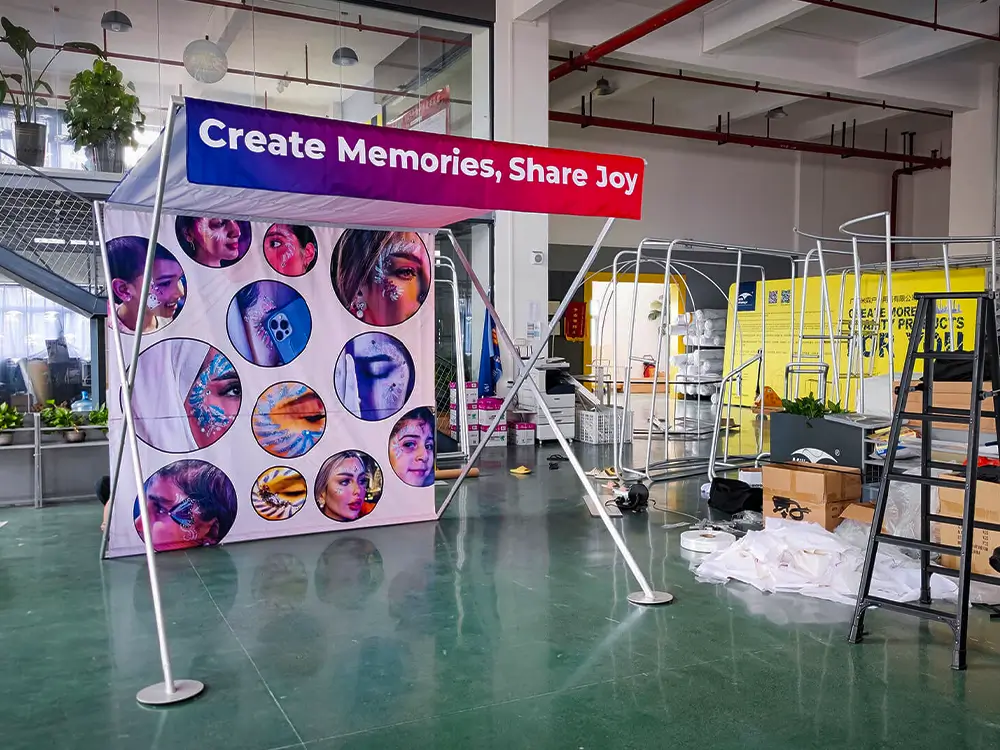 Professional Booth Configuration: The combination of a canopy, back wall, and side skirts creates a distinct and professional booth space, perfect for trade shows, markets, and promotional events to engage customers effectively.