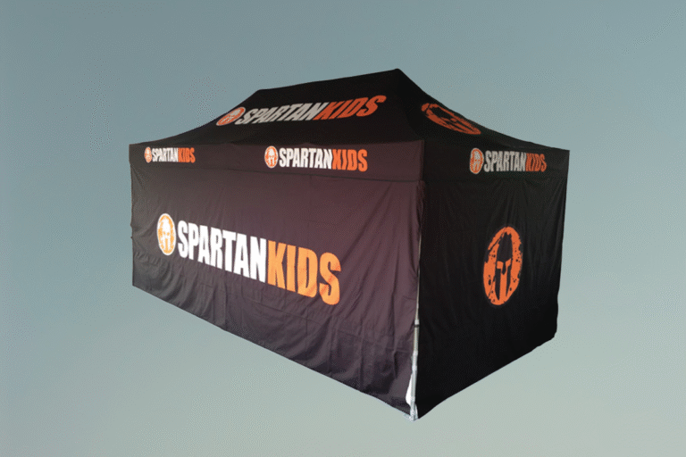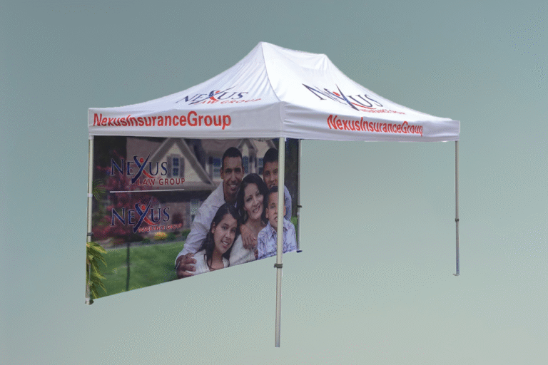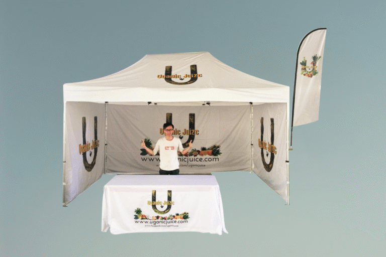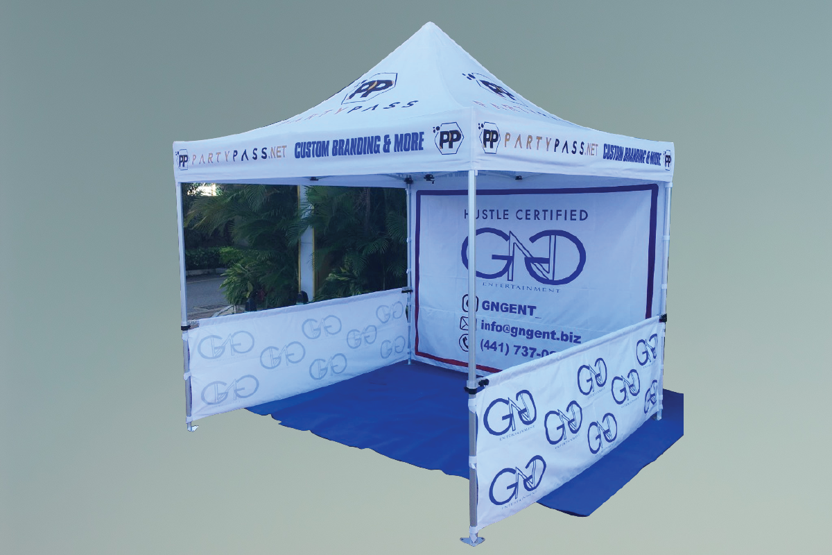 Comprehensive Custom Branding: The entire tent serves as a marketing tool, featuring full-color printing on the roof peak, valances, a full-height back wall, and matching half-height side walls to maximize brand visibility from all angles.